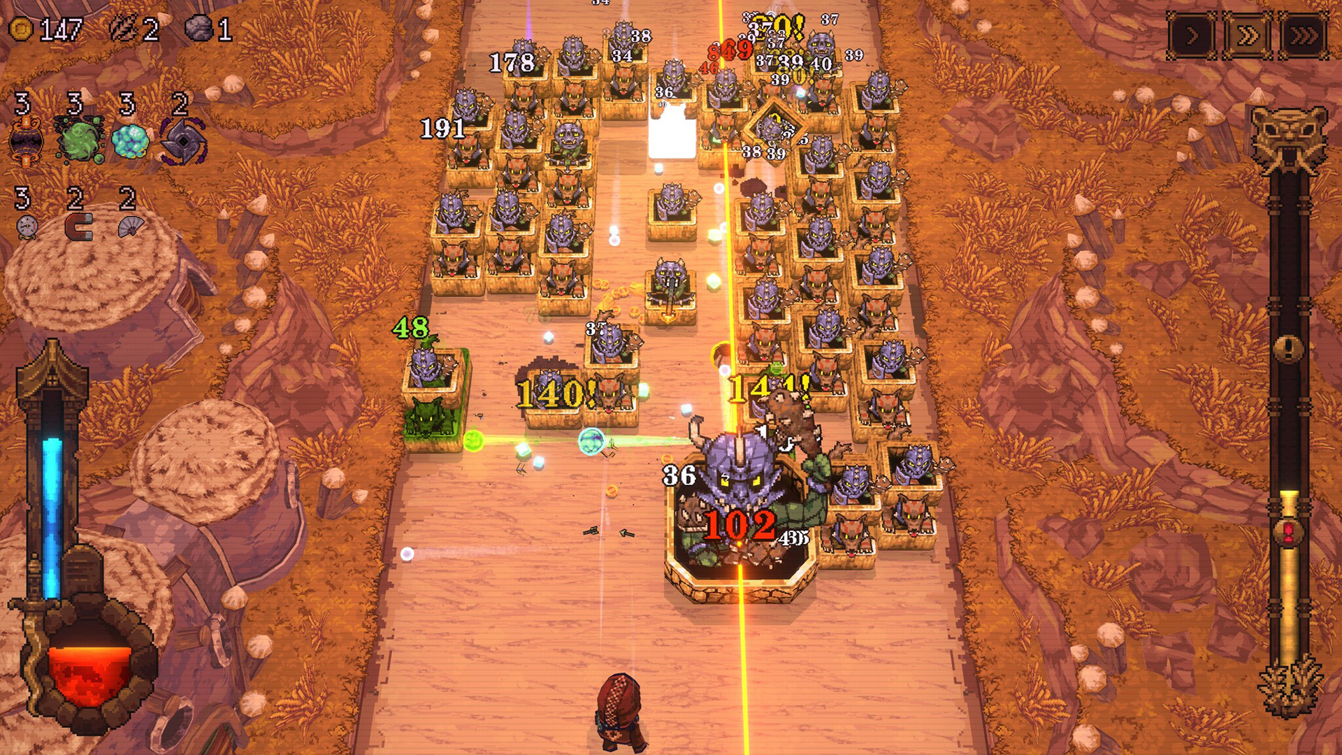 Zo speelde ik op een gegeven moment een schattenjager vrij die zijn ballen niet vanaf de onderkant, maar vanaf de bovenkant van het scherm afvuurt. Dat voelde meteen verwarrend aan, maar het zorgde ook voor een verrassend pittig potje BALL x PIT. Wat ik eerst een handige vaardigheid vond tegen de eerste baas, een groot skelet dat je alleen op z’n achterhoofd kunt raken, bleek al snel verraderlijk toen ik niks kon beginnen tegen monsters die de bodem bereikten en mij direct aanvielen. Het is dus essentieel om de juiste upgrades te kiezen, en dat verschilt per personage.