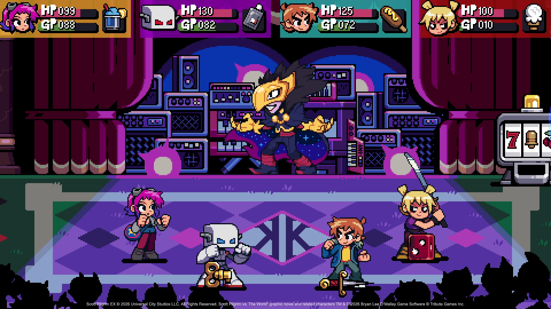 Dat kun je natuurlijk doen als Scott, wat bekend aanvoelt na de vorige game. Maar er zijn maar liefst zeven speelbare personages om uit te kiezen, die allemaal net een kleine beetje anders aanvoelen qua speelstijl. En elk personage heeft een uniek einde om vrij te spelen, dus een groot gedeelte van de herspeelbaarheid van Scott Pilgrim EX is hier terug te vinden. Andere speelbare personage zijn Gideon Graves, Lucas Lee, Matthew Patel, Ramona Flowers, Roxie Richter en de volledig nieuwe Robot-01. Daardoor voelt de game enigszins vertrouwd aan. We kennen vrijwel alle personages tenslotte al.