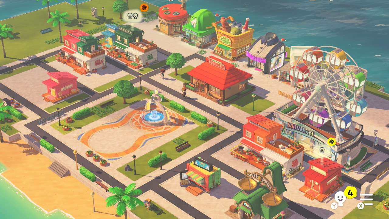 Gelukkig is daar de eilandbouwer. Die werkt ondanks dat ie niet heel uitgebreid is heerlijk intuïtief: met een druk op de knop teken je zelf de vorm van je eiland, en je schuift huizen, winkels en bankjes moeiteloos heen en weer. Hoe meer Mii’s je maakt, hoe groter je eiland wordt, en hoe hoger het level stijgt. In het midden staat een fontein die bij elke level-up wensen laat uitkomen: cadeaus, nieuwe karaktertrekjes, of de mogelijkheid om zelf dingen te ontwerpen uit te breiden. Het is een bevredigend systeem, maar het dwingt je een beetje om steeds meer Mii’s aan je bevolking toe te voegen. En dat is iets wat ik zelf eigenlijk helemaal niet wil.