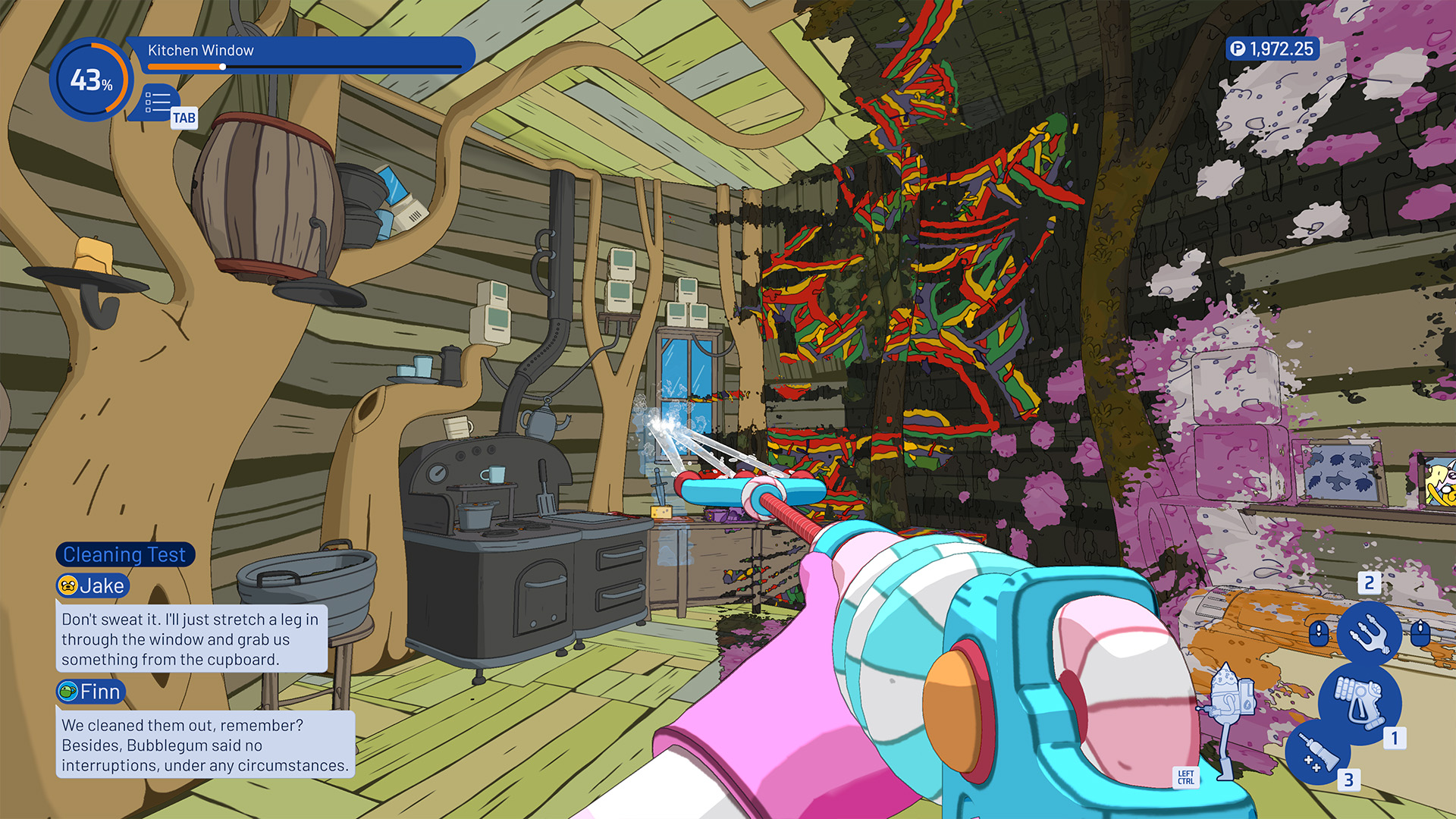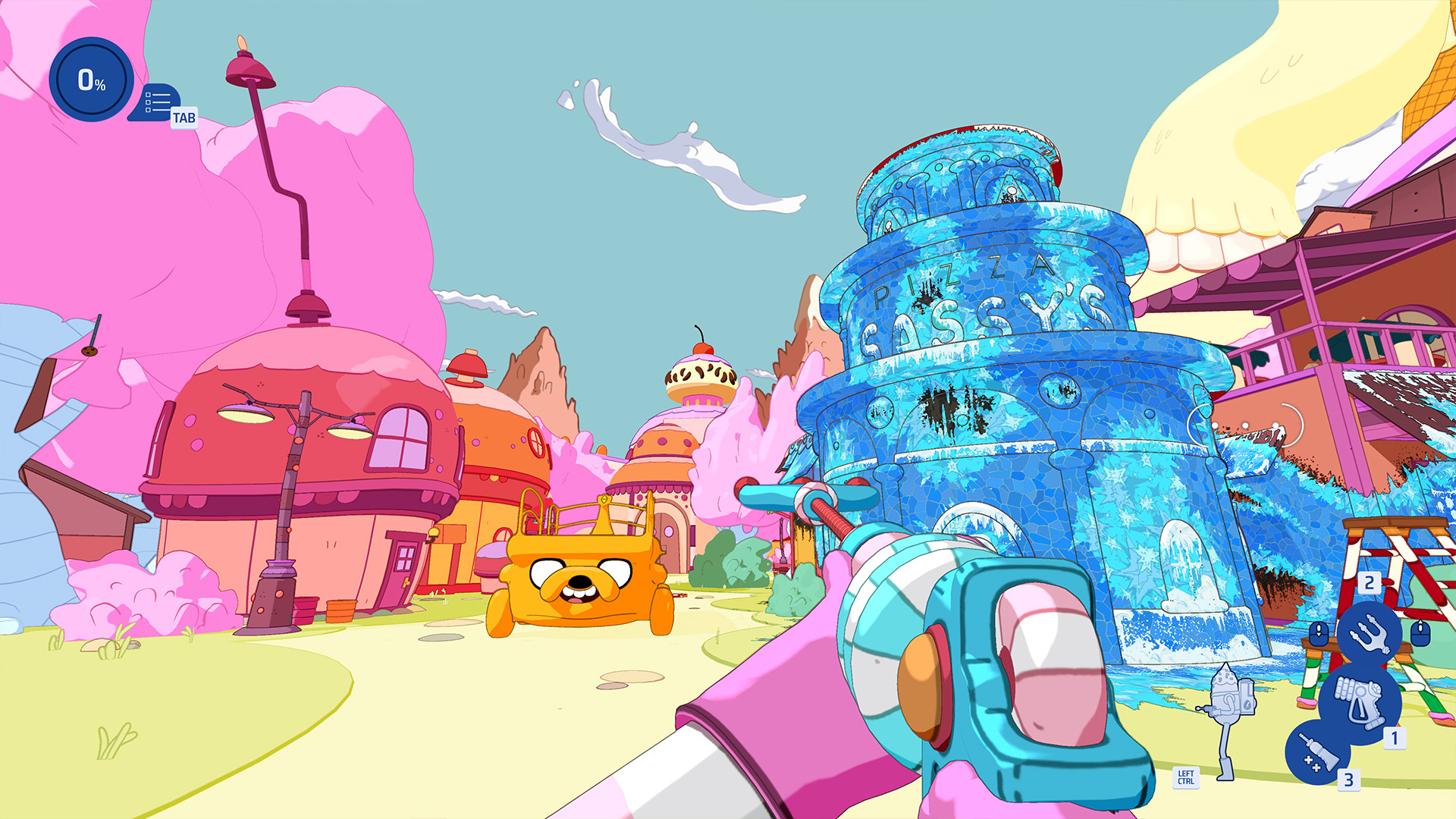 De levels bestaan uit twee voertuigen en vier bekende locaties uit de serie, waaronder het kasteel van de Ice King en de boomhut van Finn en Jake die je zowel van binnen als buiten helemaal van vuil mag ontdoen. Stuk voor stuk heb ik mij enorm vermaakt met deze levels, al vond ik de buitenkant van de boomhut verreweg het minste. Door de grote, egale vlakken die de stijl van Adventure Time met zich meebrengt, werden de reusachtige groene boomtoppen namelijk al vrij snel eentonig. Iets dat Lemongrab onacceptabel zou noemen. Uiteindelijk was ik dit paasweekend, gespreid over de vijf levels, ongeveer een uur of vier zoet, wat voor mij meer dan voldoende is voor de €7,99 die het pakket kost.