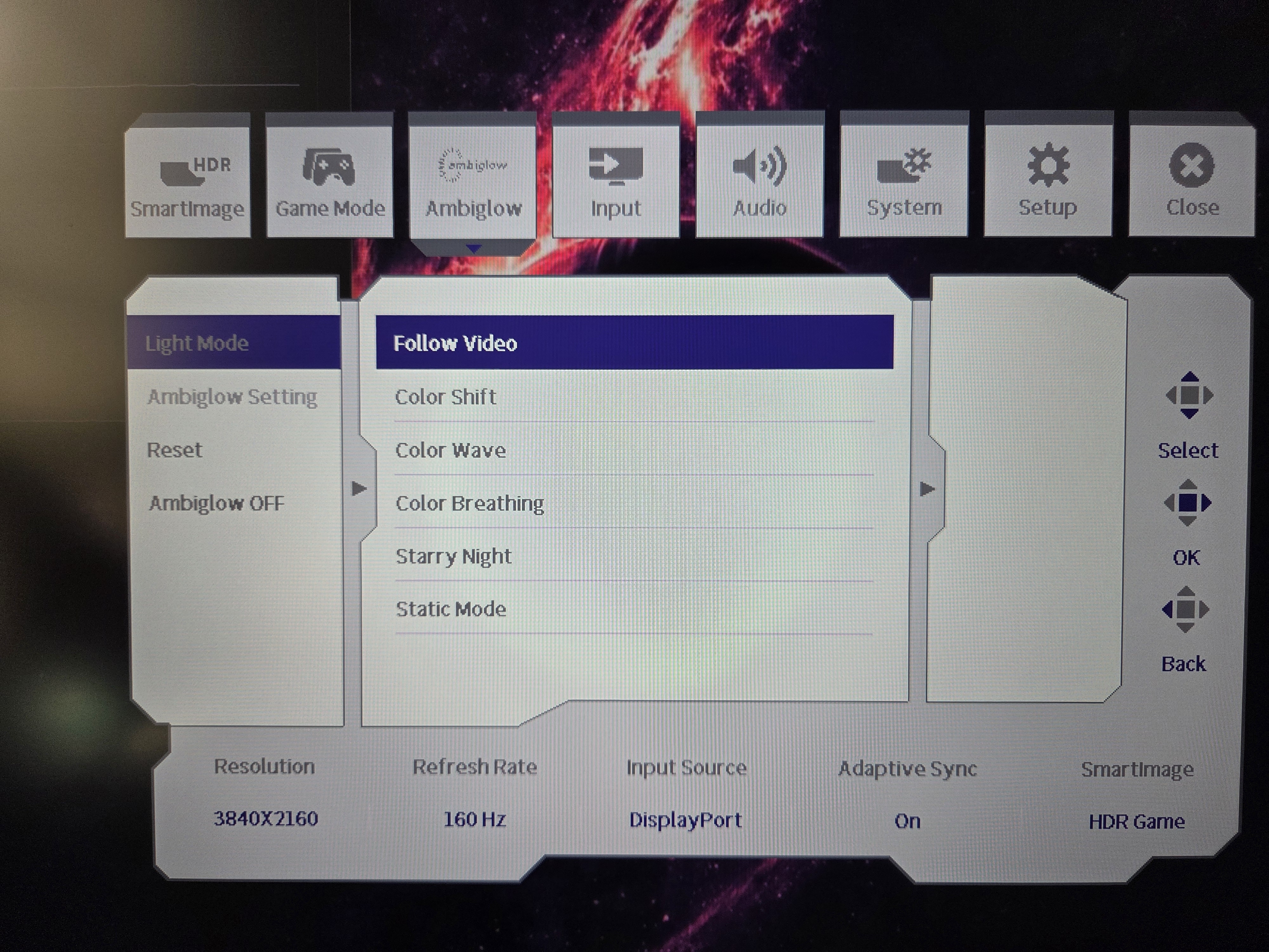 De volgende optie in het menu draait om je Ambiglow-instellingen. Aan de achterzijde van de monitor vind je een aantal LEDlampjes die de actie van wat extra sfeerverlichting kunnen voorzien. Daarbij kun je kiezen uit zes verschillende settings. Follow Video volgt de actie op het scherm terwijl de andere opties zoals Color Shift, Color Wave, Color Breathing en Starry Night met iets meer afwisseling verschillende kleuren op de muur achter je scherm projecteren. Persoonlijk vind ik het tijdens het gamen fijn om een wat statische kleur op de wand te zien zodat ik niet te snel van de actie op het scherm word afgeleid. Toch is de Follow Video-optie bij een rustige avonturengame waarbij de actie niet te snel gaat wel een sfeervolle toevoeging. Maar bij hectische shooters kan ik me ook voorstellen dat je met dezelfde instellingen ook een beetje overprikkeld kunt raken. Maar gelukkig is Ambiglow ook gewoon uit te schakelen.