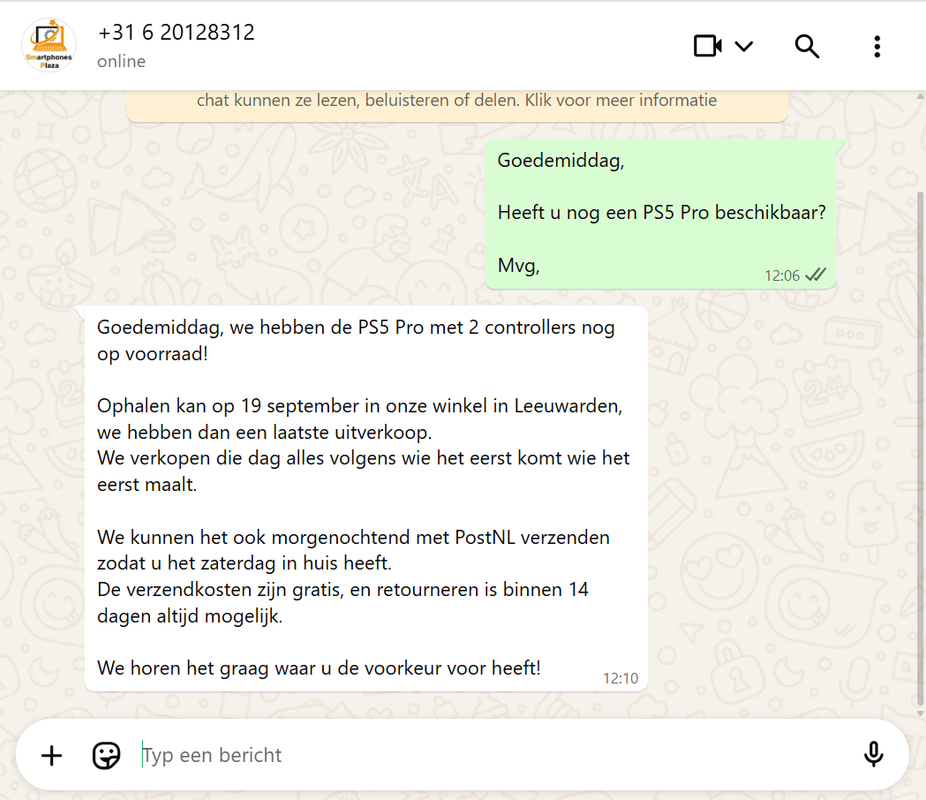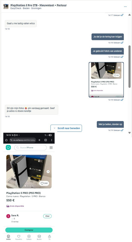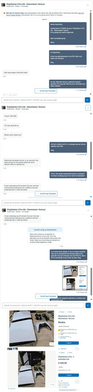 Een half uur later stond opnieuw een PS5 Pro te koop, met jawel, 3 foto's van een of andere Spaanse veilingsite- lang leve Google Search - toevallig zou je zeggen, maar ze waren zelf gemaakt! Zal wel pure toeval zijn. Staat opnieuw een PS5 Pro te koop op zijn account, kan deze helaas niet ergens elders terug vinden op het internet. Linksboven op de 2e screenshot naast de advertentie naam kun je zien dat ie dezelfde foto gebruikt die ik naar hem gestuurd heb.
