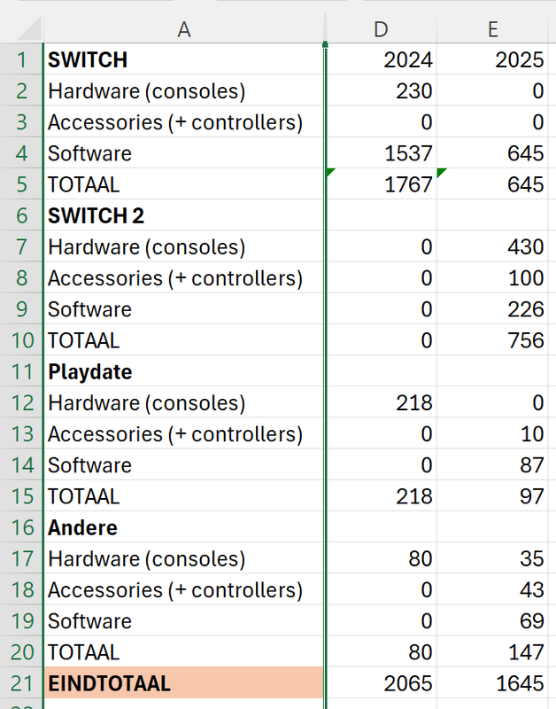 Ik heb dit jaar €1525,65 uitgegeven aan games en hardware. Duur jaar voornamelijk vanwege de aanschaf van de Switch 2, maar ook omdat ik niks verkocht of ingeruild heb.