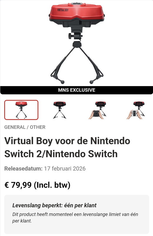 Voor de mensen die de Virtual Boy nog willen bestellen, hij is (weer?) te bestellen op de My Nintendo Store. Zit nog te twijfelen of ik hem uiteindelijk ook moet halen (al zal het meer voor de verzameling zijn. Maar €80 vind ik gewoon een te hoge bedrag