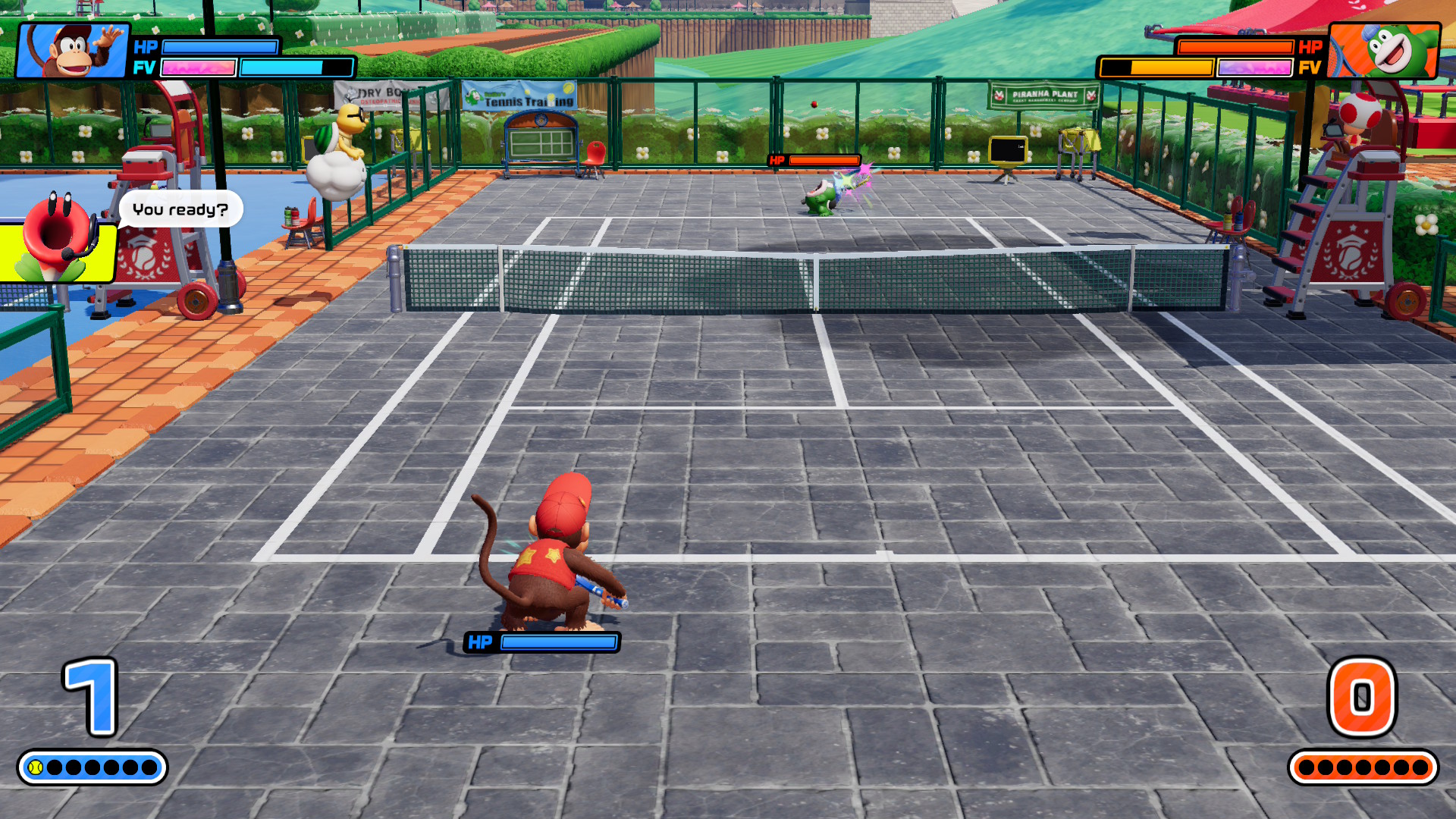 Swing Mode landt helaas ver buiten de lijnen. Enkel degenen die lijden aan een zware vorm van Wii Sports-nostalgie zullen hier meer dan een kwartier vertier uit halen. Het wordt gespeeld met slechts één Joy-Con in de hand. Er is dus geen manier om zelf te positioneren. Bovendien voelt het registreren van slagen erg willekeurig. Gemiste kans dus. Dan moeten we alle hoop vestigen op de Trial Towers. Gelukkig vermaakt deze modus wel. Deze drie torens – elk 10 vloeren hoog – beklim je door een reeks opeenvolgende uitdagingen te spelen. Zo speel je bijvoorbeeld tegen een Mario met een Flame Racket of een van de andere nieuwe Fever-rackets. Met een Fever-racket kan je een speciaal schot lanceren door op X te drukken. Dit schot kan extra precies gemikt worden, en wanneer deze landt aan de kant van de tegenstander laat dit vaak een hinderlijk effect achter. Een ander voorbeeld van een uitdaging is bijvoorbeeld 15 ballen langs een tegenstander slaan zonder dat deze een return kan uitvoeren. Sommige vloeren kunnen behoorlijk moeilijk zijn, wat na de nogal makkelijk Adventure zeker welkom is. Bovendien heb je maar 3 levens om een toren mee uit te spelen. Verlies je je laatste leven? Dan moet je helemaal opnieuw beginnen. Helaas zijn er maar 3 torens beschikbaar, waardoor je ook hier als solospeler vrij snel klaar mee bent.