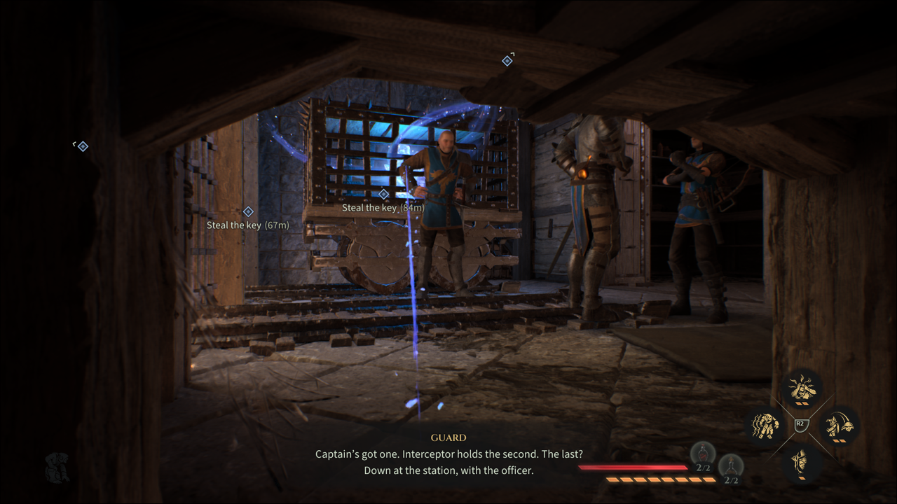 We maakten hierboven al de vergelijking met de Metal Gear Solid-reeks en daar moet natuurlijk nog één heel belangrijke kanttekening bij komen: een Styx-game kost (of krijgt) maar een fractie van het budget van een Metal Gear-game. En dat is er onvermijdelijk aan te zien. Letterlijk dan, ten eerste, want grafisch presteert Styx: Blades of Greed ondermaats. Wat meteen opvalt is dat er heel wat aandacht besteed is aan het uiterlijk van het hoofdpersonage, dat gedetailleerd en verzorgd oogt. Dat staat in schril contrast met alle andere personages in het spel: zowel je handlangers als je vijanden zijn precies wassenbeelden versies van zichzelf. De belichting in het spel is pover en er zijn zoveel gebouwen in de omgeving losweg gekopieerd en geplakt dat ik de lijmresten van de omgevingsdesigner nog aan mijn met wratten bedekte goblinhanden voelde plakken. De tekenafstand is bedroevend en het helpt ook niet dat de framerate in elkaar stort zodra je je wat sneller voortbeweegt. Ik heb mijn PlayStation 5 nog nooit zo vaak horen stotteren als tijdens het spelen van Styx: Blades of Greed. Dit spel hangt op technisch gebied met haken en ogen aan elkaar.