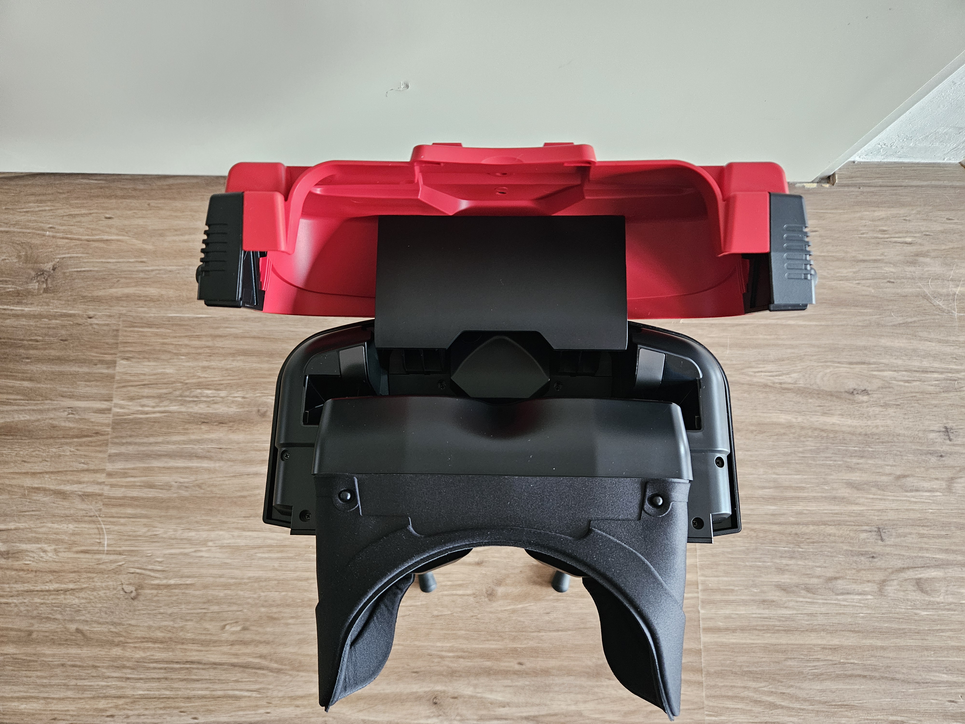 In de doos van de plastic Virtual Boy vind je de bril, een voet waar de bril op kan, een tussenstukje voor de originele Switch en een quickstart guide. Nadat je de voet met de klem op de bril hebt gemonteerd, staat je nieuwe Virtual Boy op de tafel te pronken. De bouwkwaliteit is uitstekend. Ondanks de op het oog instabiele pootjes staat de headset stevig en zal hij niet snel omvallen. Alle kleine details van de originele Virtual Boy zijn aanwezig. Denk bijvoorbeeld aan de focus knop en zelfs de rubberen zijkanten. De knoppen werken of klikken helaas niet, dat zou hem nog vetter gemaakt hebben. De bril kan open, waarna de Nintendo Switch (2) erin kan glijden. Met de Joy-Cons in de hand ben je dan klaar om, al turend door de rode lenzen, de rood gekleurde Virtual Boy spellen te gaan spelen.
